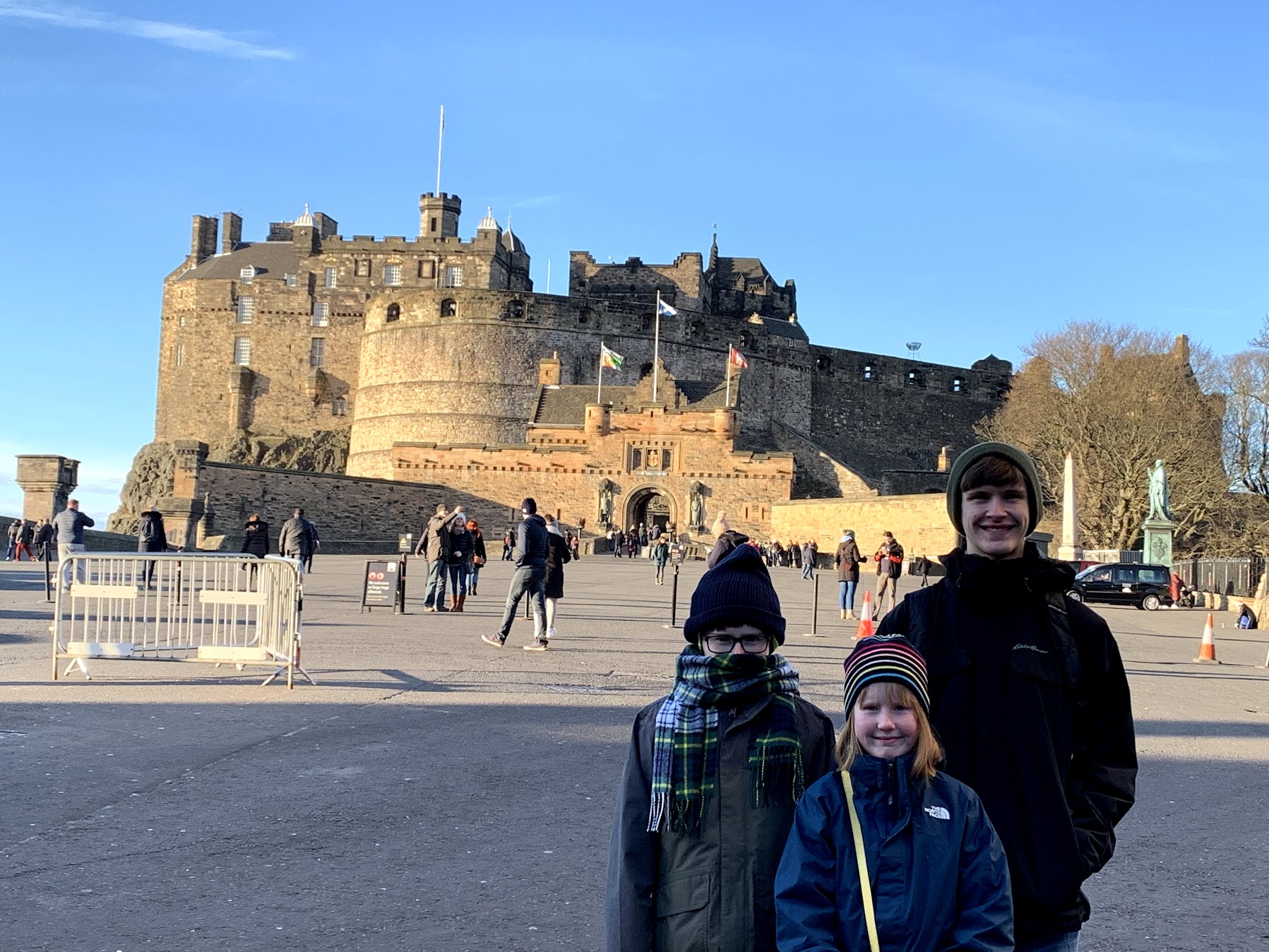 Bundled up and ready to head out into the city we were greeted with the crisp morning air! It was actually a bit warmer in Edinburgh than it was in St. Louis and even Grand Rapids. The temp was about 5C or 41F. We climbed up the steep hill from Princes Street to the Royal Mile and then rounded the corner to the entrance of Edinburgh Castle. This fortress has had a presence in the city since around 1000AD. Once inside we were treated with a lovely 30 minute basic informational tour by Gabby and then spent the rest of the day meandering in and out of all the interesting castle buildings. In total we spent about 5 1/2 hours in the castle. Robert and I have visited the castle before, but there were many new exhibits and it was lovely seeing it in sunshine! Yes the sun was shining in Scotland in January!