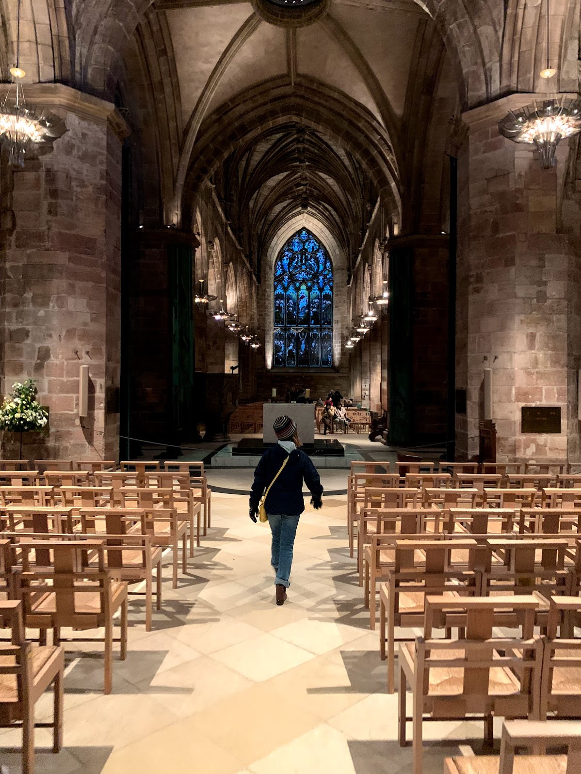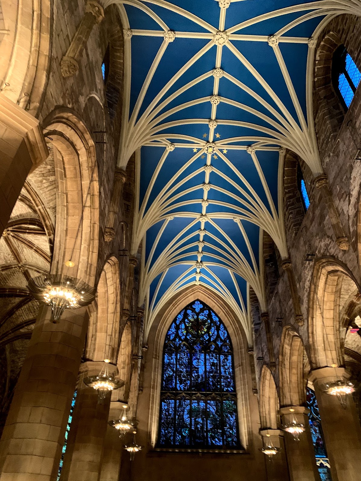 We left the castle and headed down the royal mile. We all purchased nice warm scarves at various shops because it was getting chilly as the sun set. About three blocks from the castle we came upon the famous St. Giles Church. Originally Catholic it now is a Protestant church and a landmark within Edinburgh’s “old town”. The inside was beautiful and I loved how the arched ceiling vaults were painted to look like the sky.