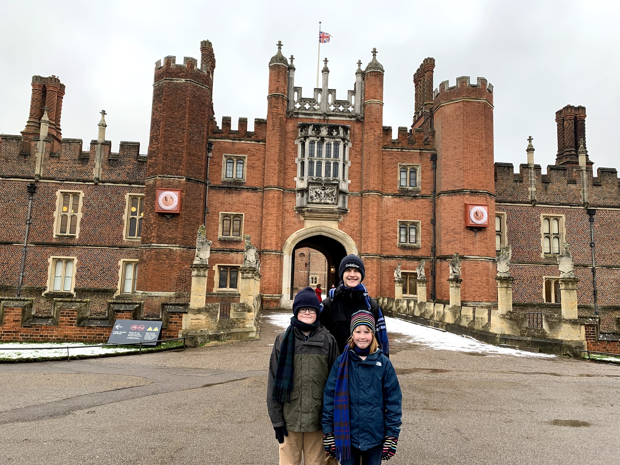 A family favorite from today’s day excursion included the 45 minute Queen Anne tour. Two women dressed in period costume acted as members of the queen’s staff and treated us as if we were visitors to the palace in 1702. This is when Queen Anne took the throne. Other enjoyable parts of the palace were The Great Hall, Chapel Royal which is still in use today as a place of worship, Georgian Drawing Room where we sat and played games as the couriers would, and the massive Tudor period kitchens! The kitchens in particular were a favorite because of the real fire burning in the huge fireplace. Very few of the palace rooms had heat and it was wet, drizzly, and chilly today. The docents all wore red wool knee length coats, which made them easy to spot as well as kept them toasty warm. We too warmed up on the 35 minute train ride back to Waterloo Station.