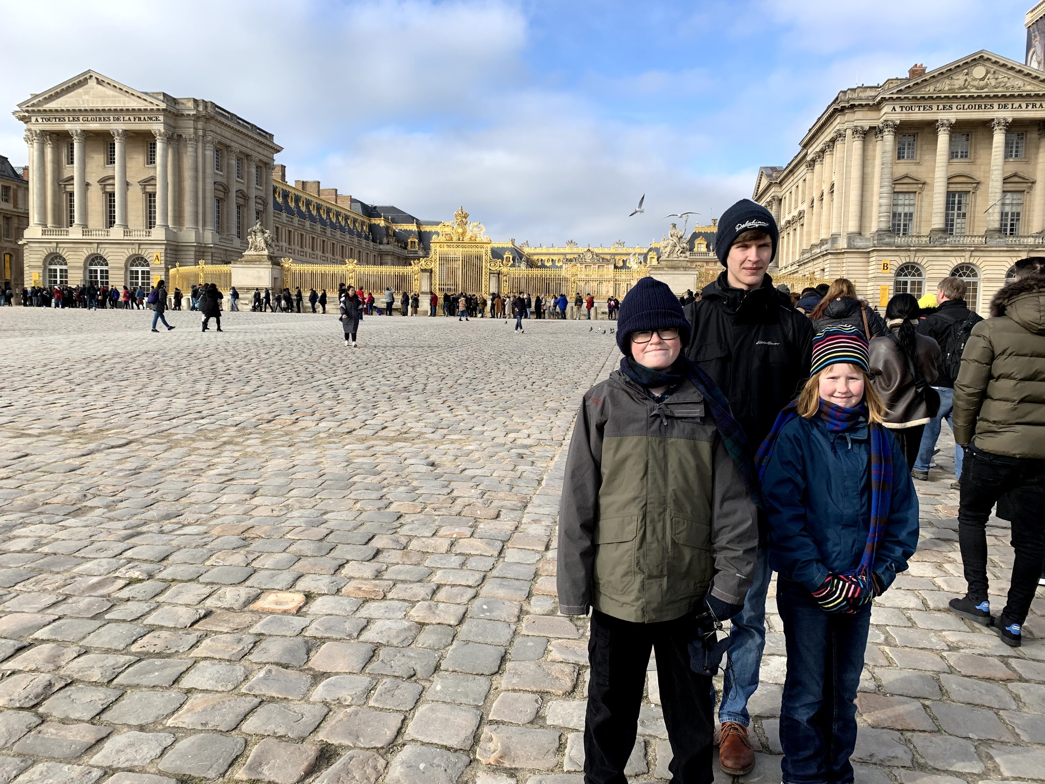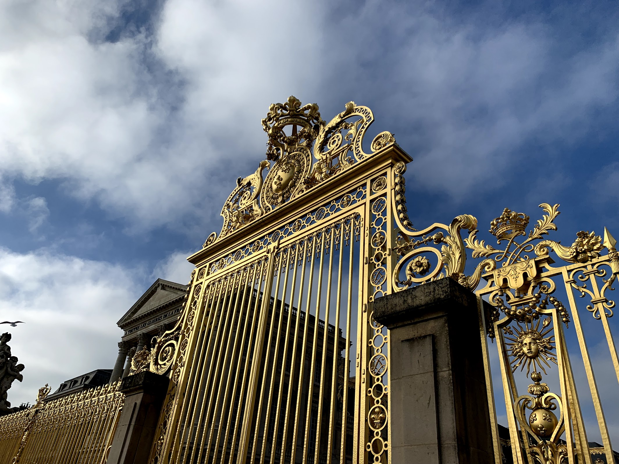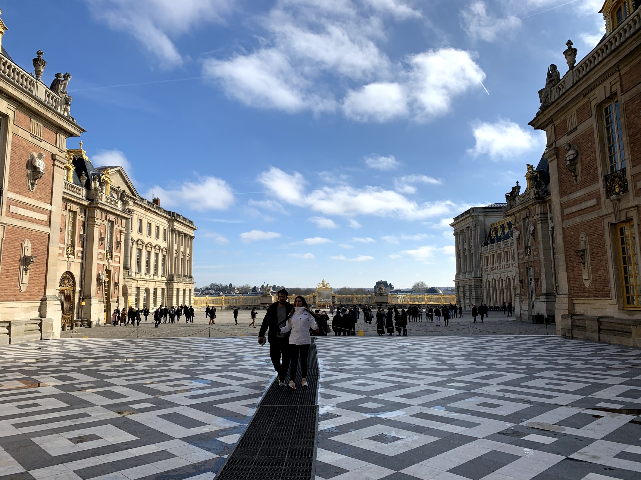A quick jaunt down the street and we boarded our first double decker metro train, which took us out to Versailles. Located about 20 miles southwest of Paris, it took us about an hour to reach our destination. We enjoyed seeing all of the Parisian suburbs and little villages outside of town every time we stopped. Once we arrived at the town of Versailles we walked down the main double boulevard up to the gates of Chateau Versailles. It wasn’t hard to miss with its stunning golden gates and large black and white marble square. The palace itself is three sided with the most opulent building in the middle.