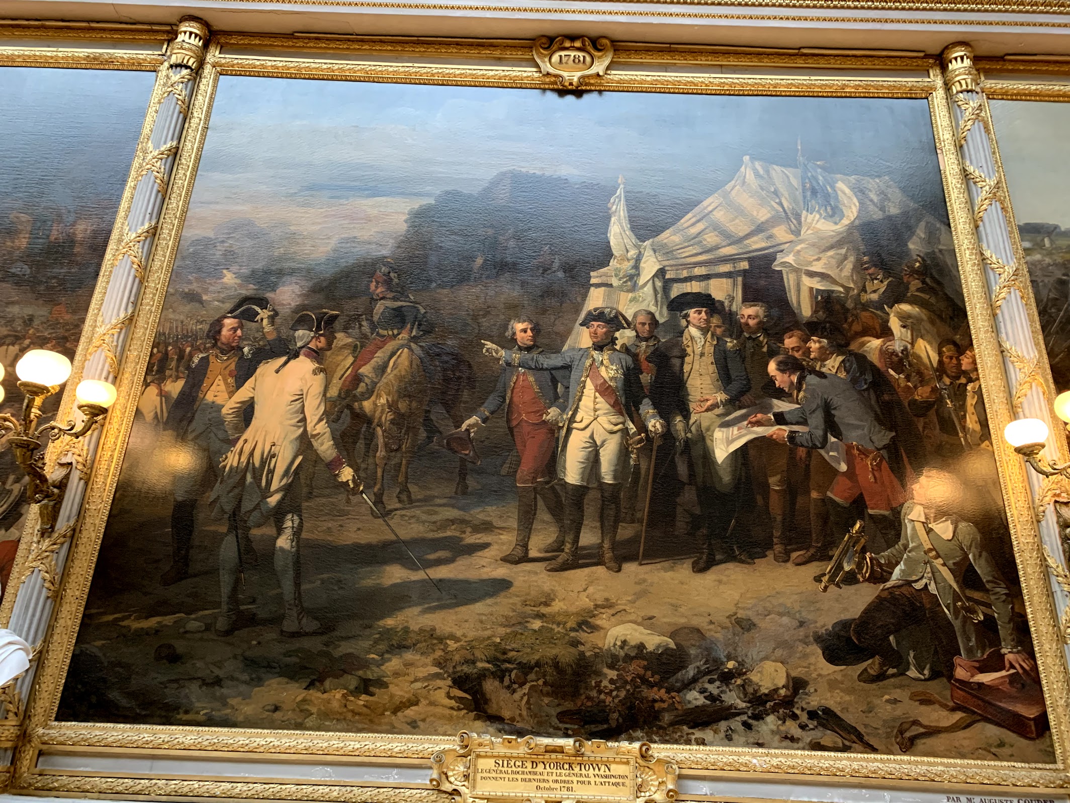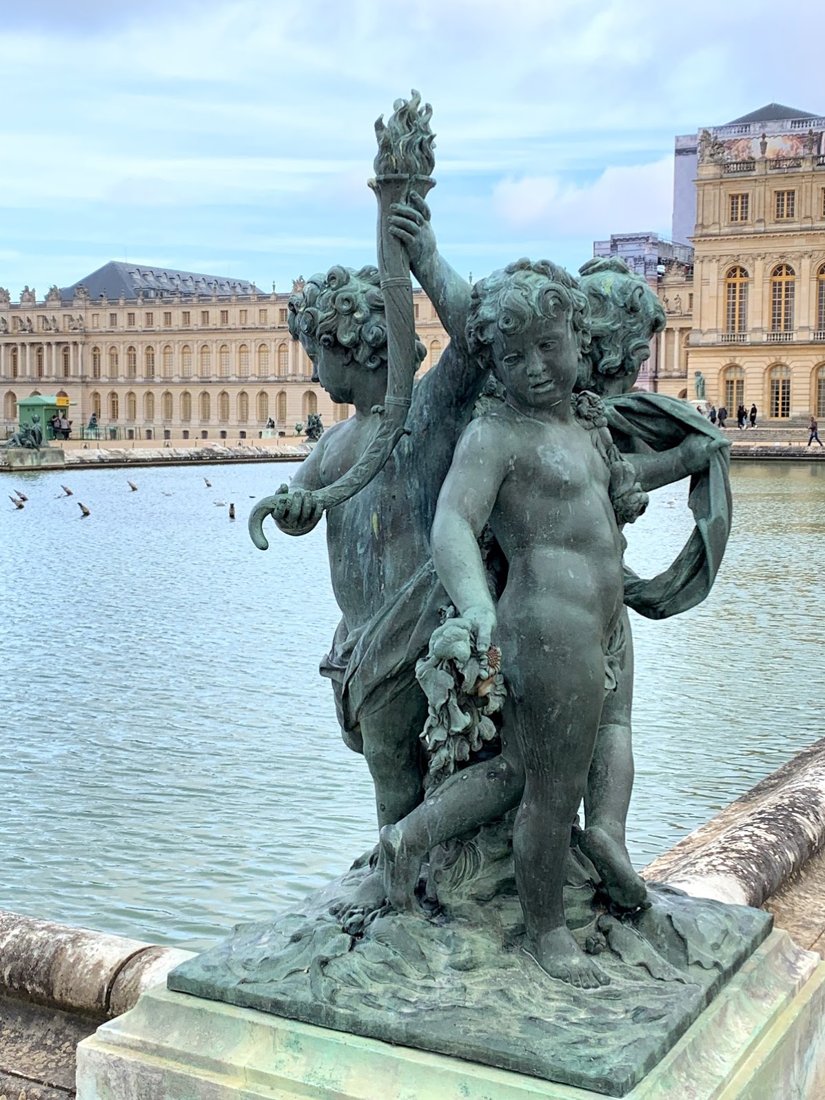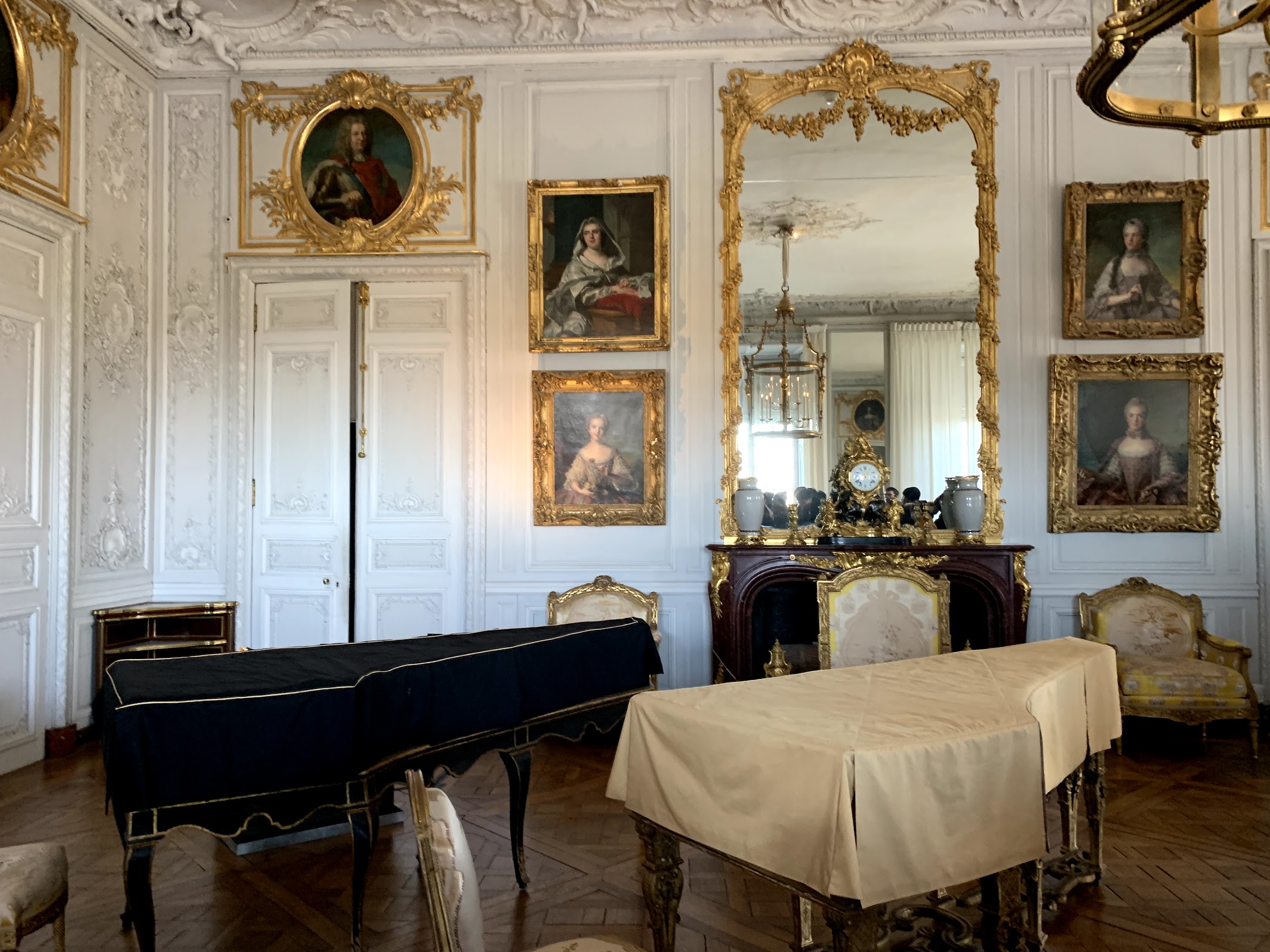 We stepped first into the apartments of the daughters of King Louis XIV the Sun King! Louis XIV built Chateau Versailles starting in 1682 and it was completed (including the gardens) 40 years later. It started off as his favorite hunting lodge, a place to get away from the busy life and lights of Paris. Louis commissioned the first middle palace and later added on the two wings for family and courtiers. He often held elaborate masquerades in the square behind the glittering gold gates!