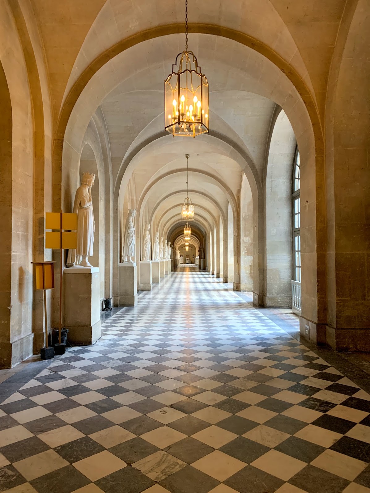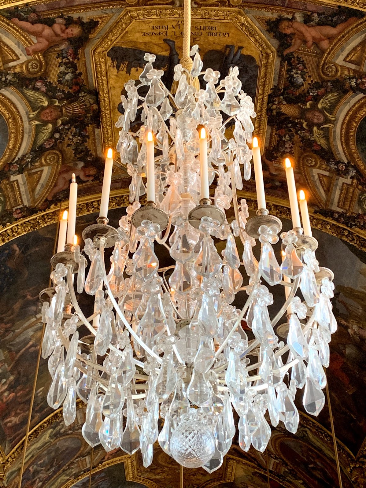 Believe it or not we were in for a further shock to our optical sensors. After a quick pass through another tame looking black and white marble antechamber we went into the famous Versailles Hall of Mirrors! This long salon is where Louis “shined” as the Sun King. 17 gold and fine glass floor length mirrors stood opposite 17 corresponding windows. Massive candlelit chandeliers hung up and down the 25+ foot tall salon where Louis hosted banquets and balls!