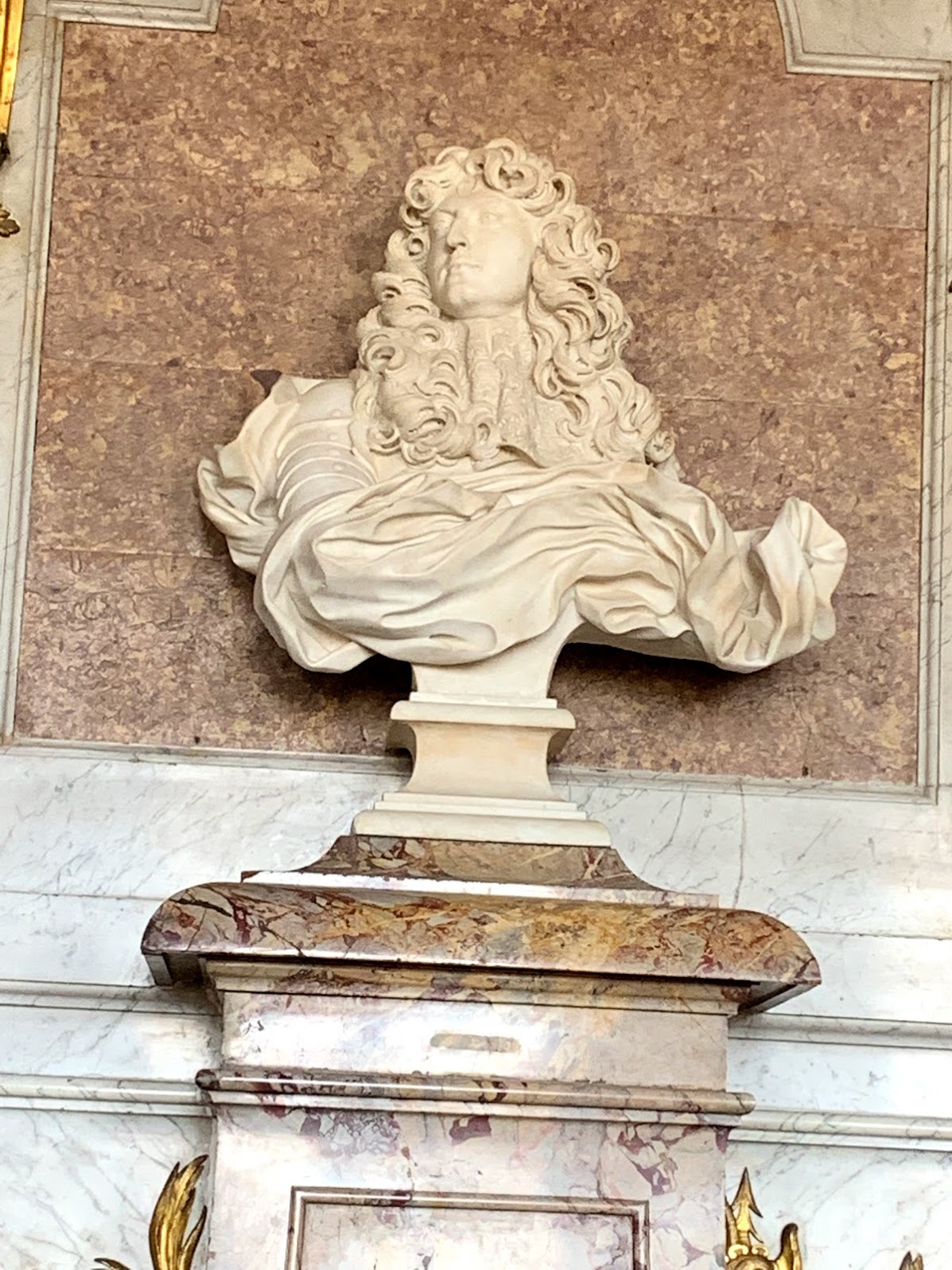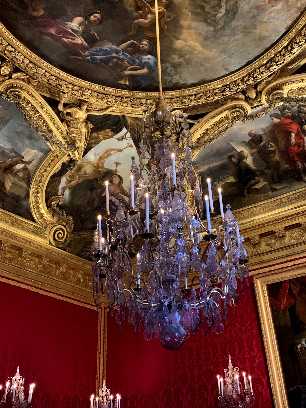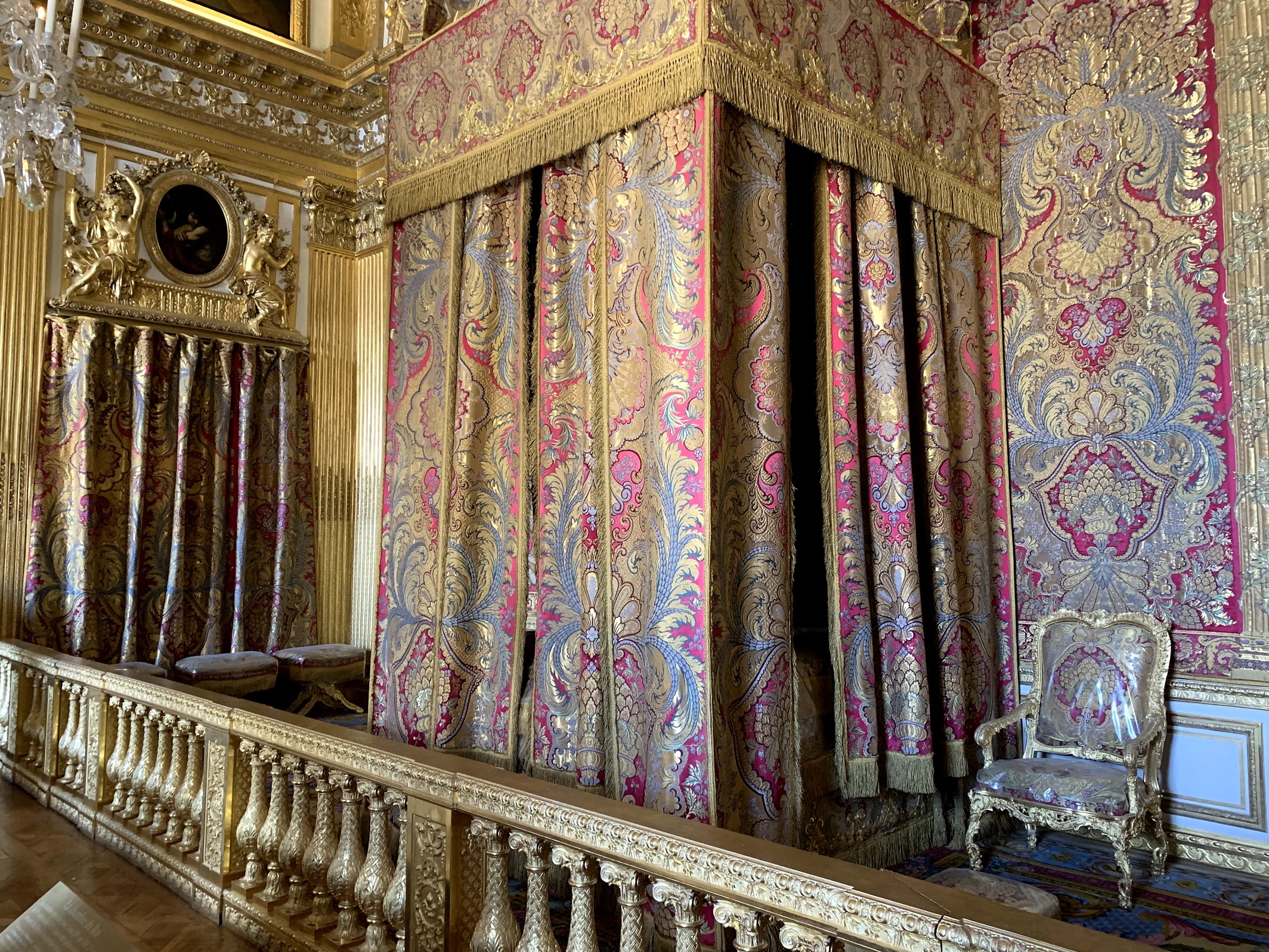 The opulence of his daughters’ apartments was breathtaking, but came nowhere near the gilded glory and voluptuous velvets that met our eyes in the King and Queen’s own private apartments. It was customary at the time that as one progressed down the hallway each room in the apartment became more and more grand and also private too. By the time we reached the King’s private bedroom not one inch of the wall was left plain. Paintings on the ceiling and walls, gold carved trim, grand mirrors, and fine tapestries made the room overwhelmingly beautiful! It was almost too much to take in at one viewing!