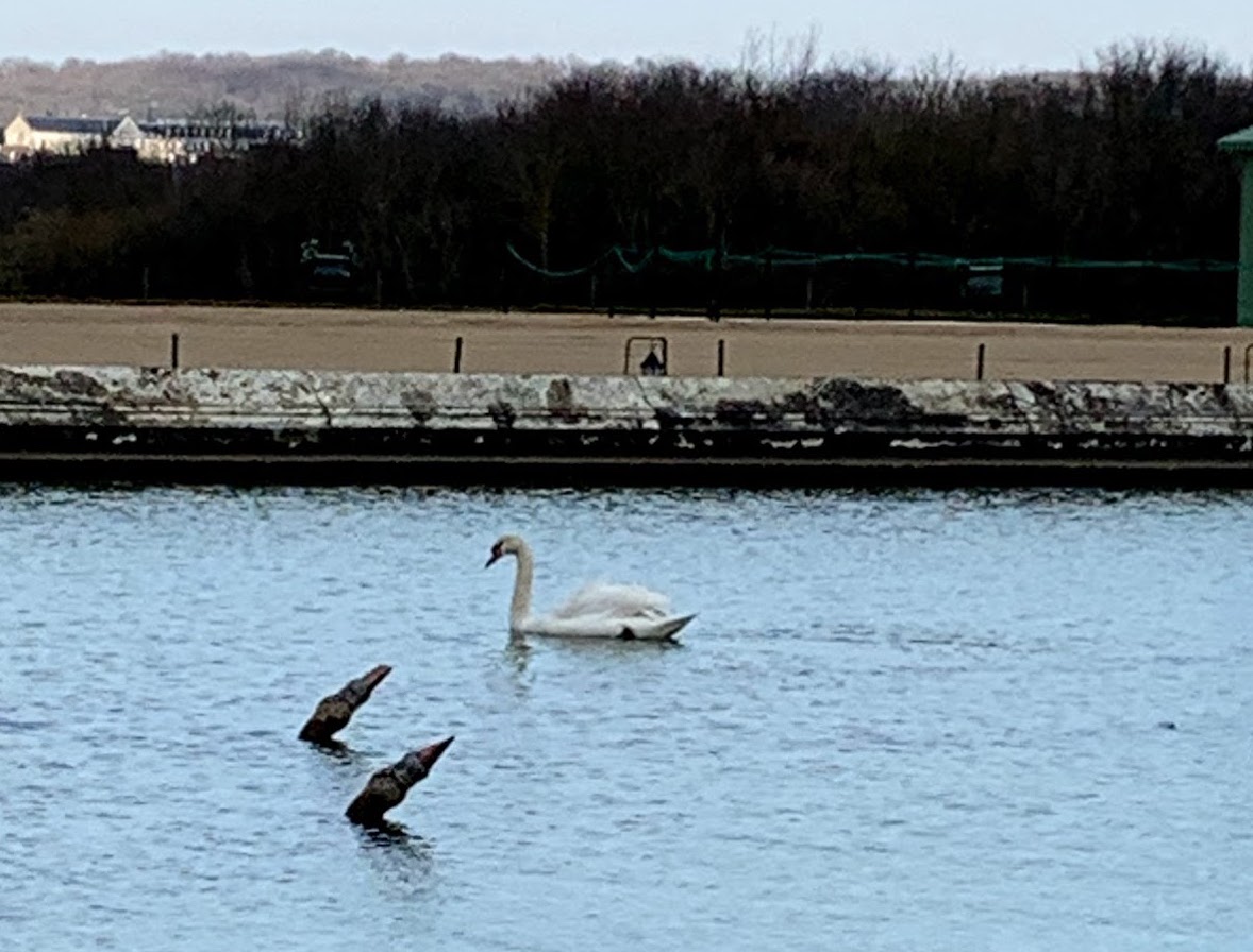 In the gardens our eyes had a chance to readjust to “non-blingy” spaces. The gardens though not in bloom were still lovely to walk around in because you could see the formal hedges with reflecting pools. Even a lovely white swan glided past as we gazed out onto the shallow oblong pool where the ornamental evergreen shrubs softened the gravel paths and the stone carvings.