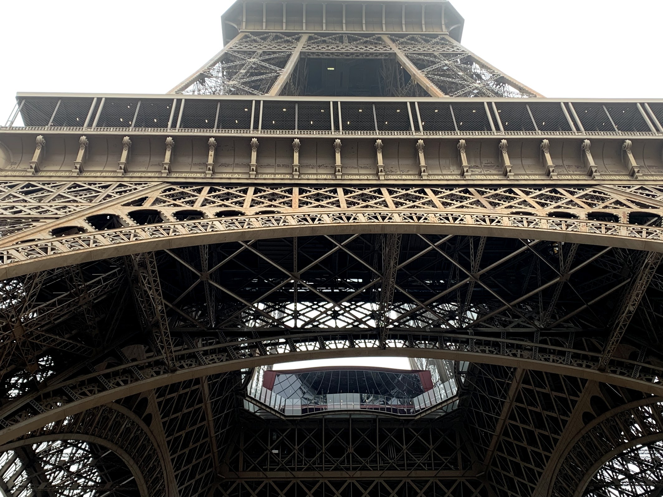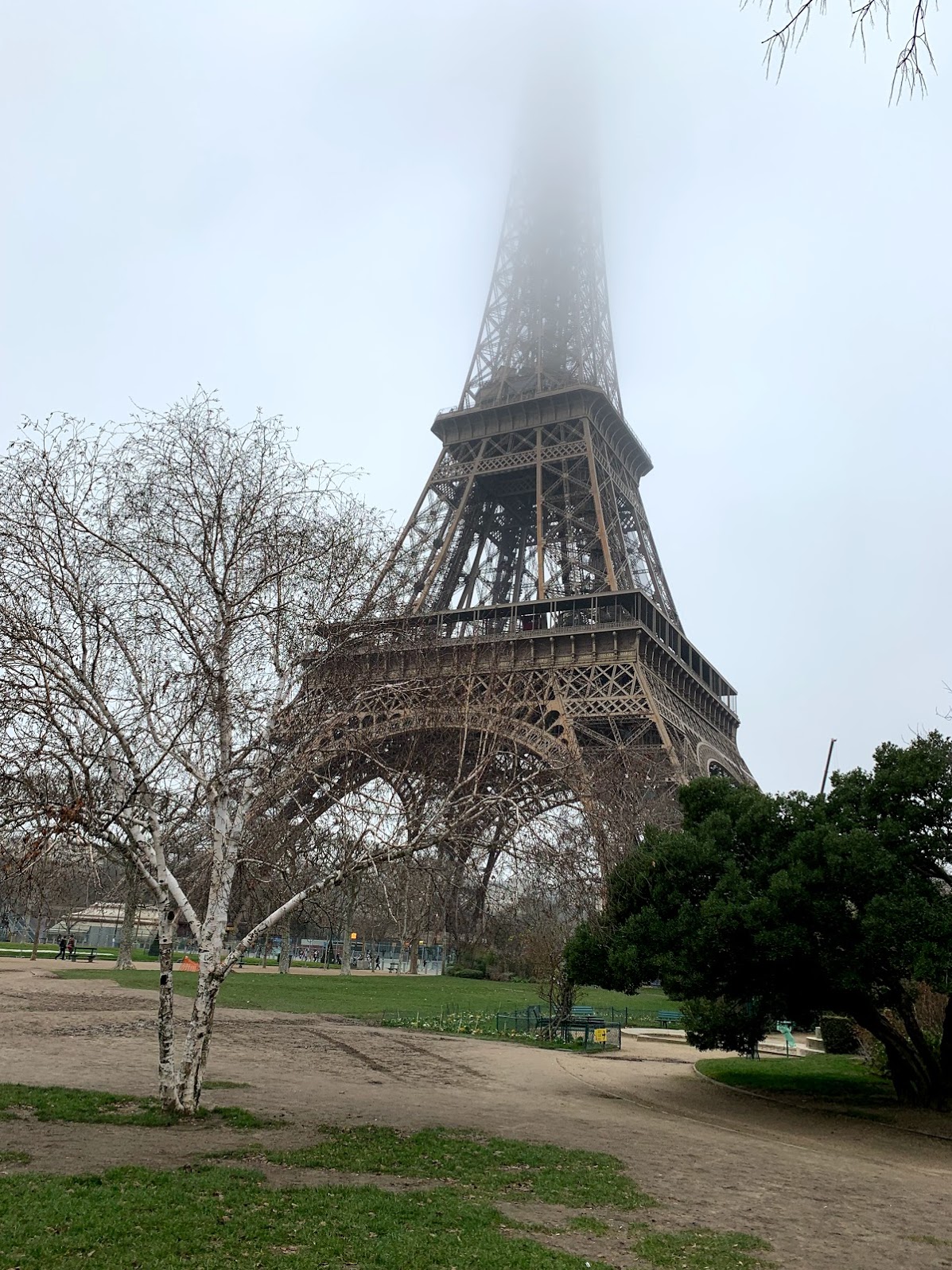 What would a trip to Paris be without seeing the iconic symbol of love, the Eiffel Tower!!! We walked to the local Metro subway and rode out to the nearest stop by the Eiffel Tower. But where was it? Once above ground we walked a few blocks, but couldn’t seem to find it. Until… voilà we rounded the corner and hidden in a dense fog we saw the bottom of the tower!