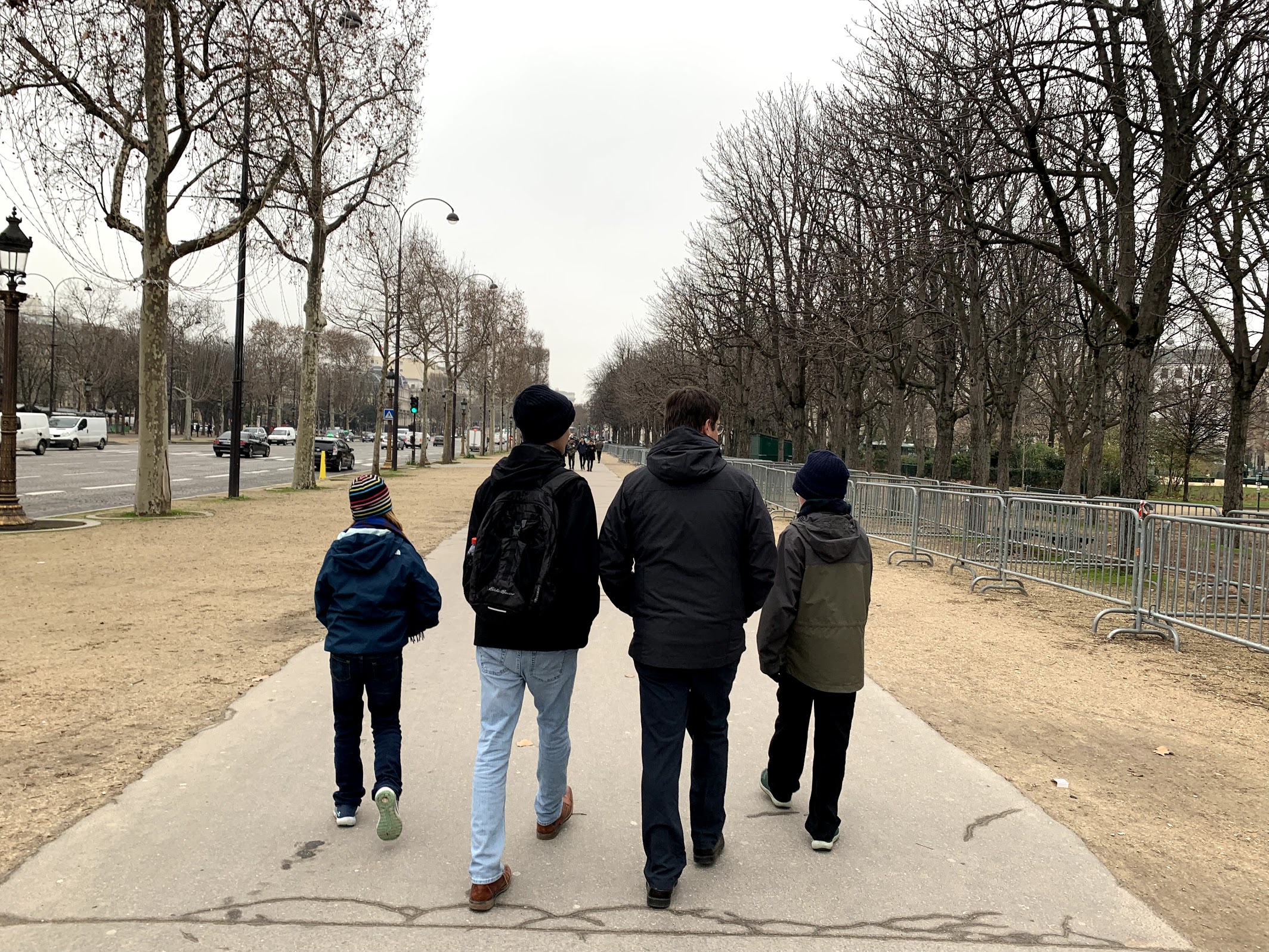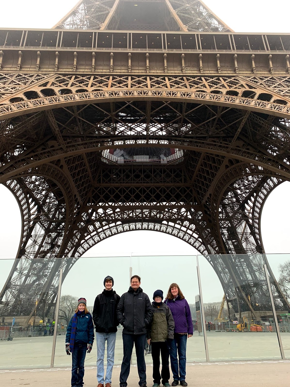 As we walked closer more of the upper tower became visible. We walked out in front of the Tour Eiffel into the Champ de Mars (gardens that are in front of the tower). Before doing so we went up to the base and gazed at the amazing metalwork. It was very impressive. While there a nice lady named Crystal, from Australia, offered to take our family photo. I in turn took a photo of her and her friends.