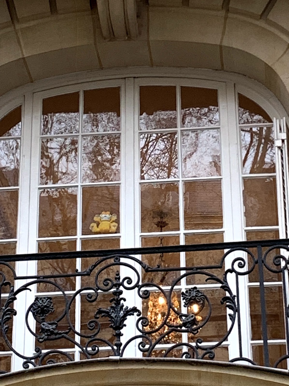 On our way to the Champs-Elysées we passed by a multi-million dollar apartment with a view of the Tour Eiffel and what did Robert eye in the window, but a Garfield plush toy suctioned cupped to the windowpane of the balcony doors! We found something else interesting on our walk to the Champs and Arch de Triomphe…a Congolese passport in the middle of a cross walk. Robert picked it up and he turned it in at a local police station. The station was located just across the Alexander III Bridge and in front of a large statue of Charles De Gaul. The statue is the beginning of the Champs-Elysées. The first part of this famous road is lined with trees and a garden. The second half has beautiful buildings and high-end shops. It’s the 5th Ave of France.
