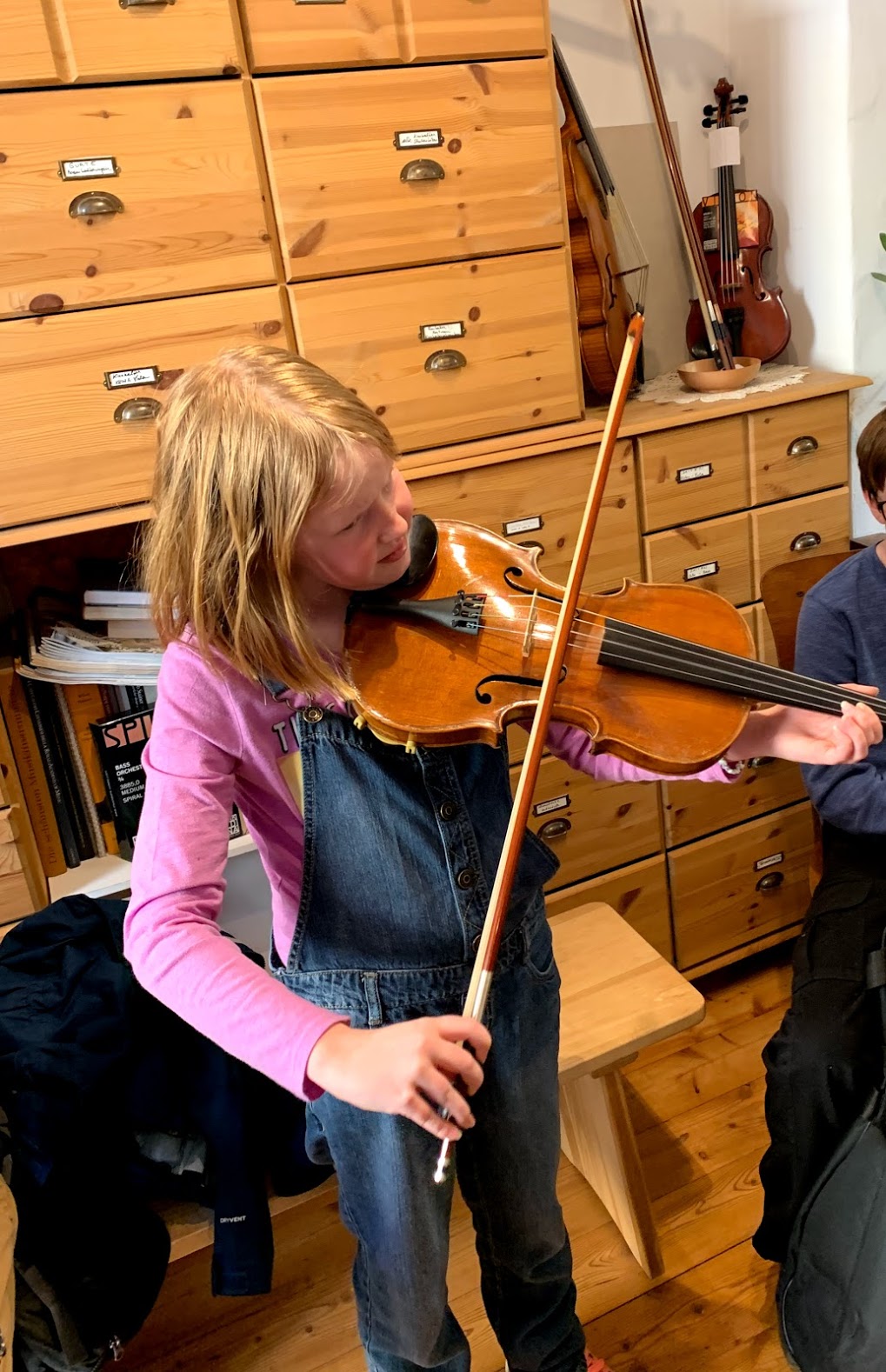 Faywen was next. Unfortunately her viola is bigger than the one at home, but it looks like a good fit size wise for her. Ms. Wagner was very sympathetic and said that if Faywen doesn’t take to the larger instrument then she will call around to other luthiers in Austria and find a smaller viola. I’m happy to say after two days of practicing Faywen is adapting fine to the instrument. She sounds really good on it and the more she plays the more confident she is where to place her fingers. Because it is a larger instrument, the fingerboard is also larger and she must relearn where to place her fingers to make each pitch. She’s learning quickly and when she starts her lessons her teacher will be able to help out too.
