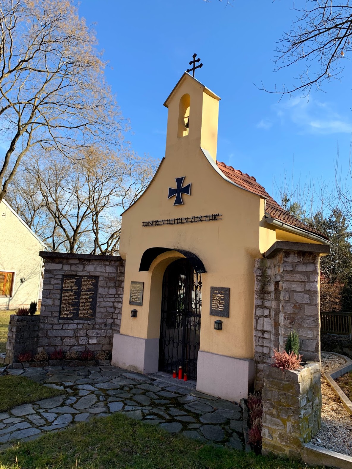 On our way home I decided to take a few photos of our neighborhood. This is a WWI and WWII war memorial near the corner of the street we live on. It’s humbling to see a memorial for the dead from the other side of history.